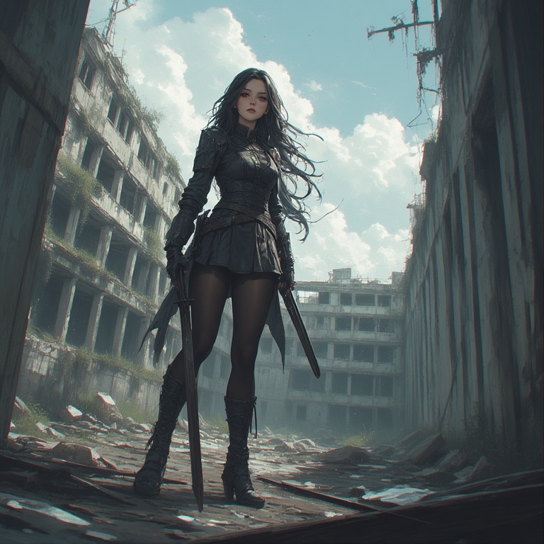 In a world of chaos and rubble, emerges our girl YO, like a beacon of style amidst the wreckage. Picture this: a scene straight out of a post-apocalyptic fashion show. YO, clad in a white tee, a sleek black leather jacket, and black pantyhose so snug they could rival a second skin. And let’s not forget those killer Black Leather-Look Low Block Heel Boots – because fashion must prevail even in the midst of destruction!